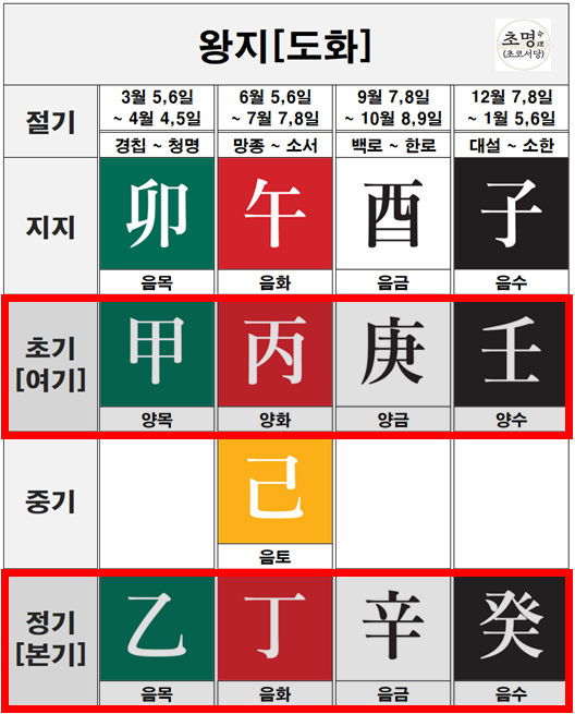 왕지는 계절을 대표하는 기운이지만, 왕성한 계절의 기운을 안정적으로 유지하고 품어야 하기 때문에 정기가 음간으로 이루어져 있다고 보는 것이죠.
