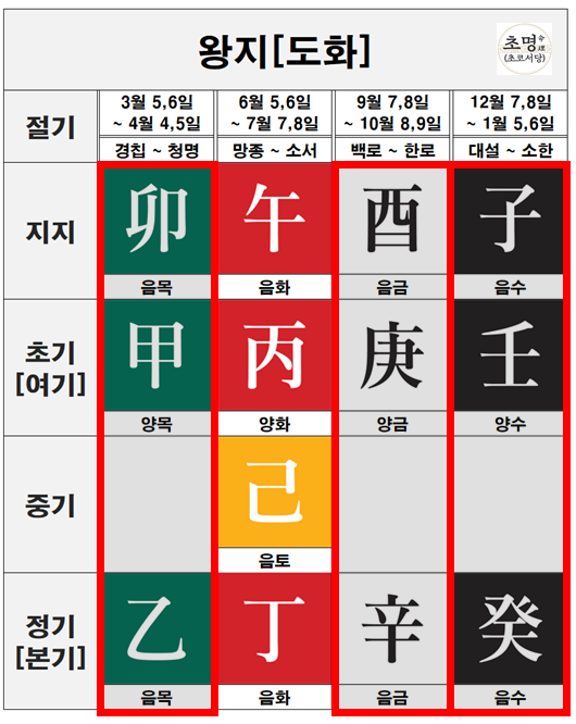 아이러니하게, 자오묘유(子午卯酉) 왕지의 정기는 모두 음간로 이루어져 있습니다.