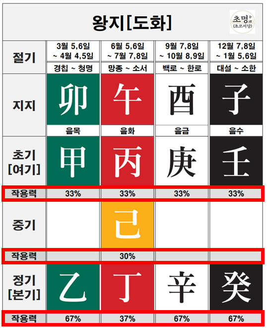 오화(午)를 제외하고 왕지의 작용력은 초기(33%), 정기(67%)로 동일하다는 겁니다.