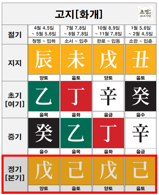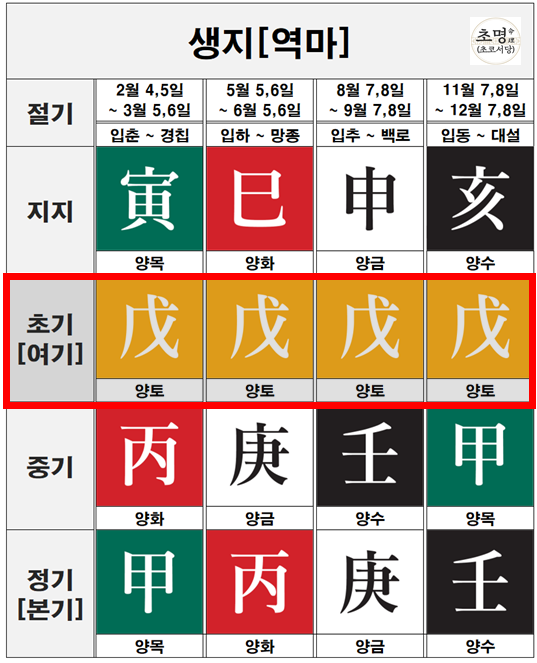 이런 생지들의 지장간 초기가 무토라는 것은, 무토가 서로 다른 계절의 끝과 시작을 훌륭하게 중재하며 이어주는 중요한 역할을 하고 있다는 뜻입니다.