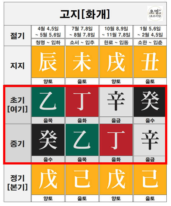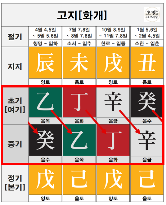 지장간의 초기는 해당 계절의 양간으로, 정기는 해당 계절의 음간으로 이루어져 있습니다.
