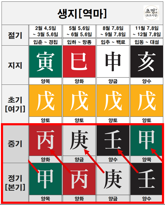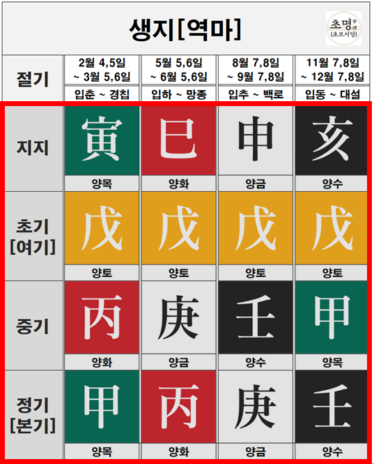 위 이미지를 보시면 생지인 인신사해의 지장간 모두 초기, 중기, 정기가 양간으로 이루어져있다는 것을 확인할 수 있습니다.