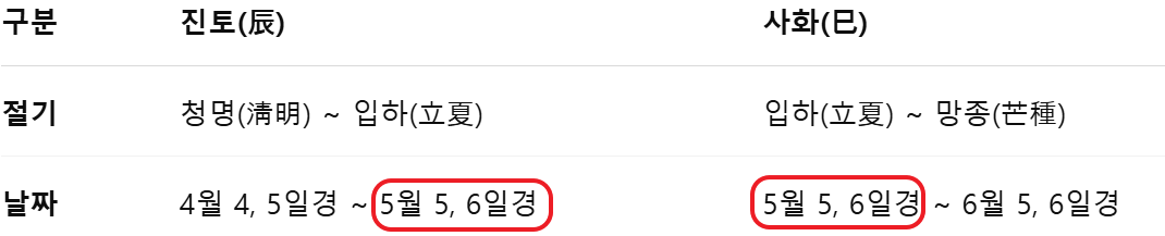 봄(春)의 끝을 상징하는 진토(辰) 정기가, 여름(夏)의 시작을 상징하는 사화(巳) 초기와 서로 맞닿아 있습니다.