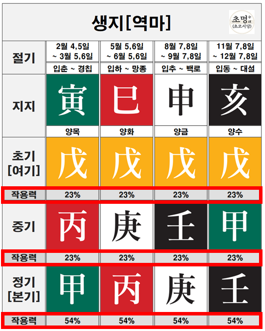 한 달 30일 기준으로 생지는 초기 7일, 중기 7일, 정기 16일의 비율로 지장간의 기운이 분포되어 있습니다. 이를 퍼센트로 환산하면 대략 초기 23%, 중기 23%, 정기 54%가 됩니다.