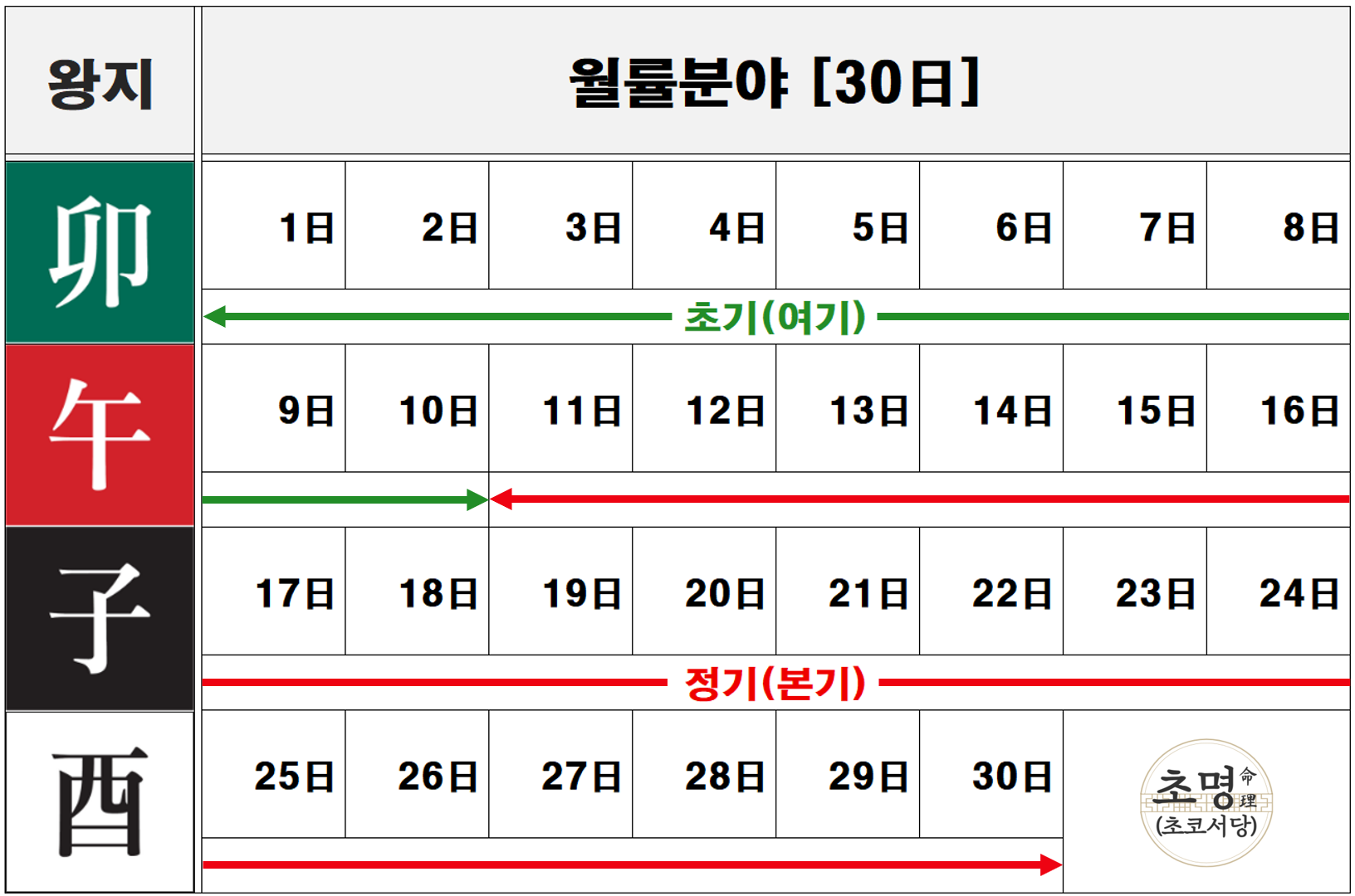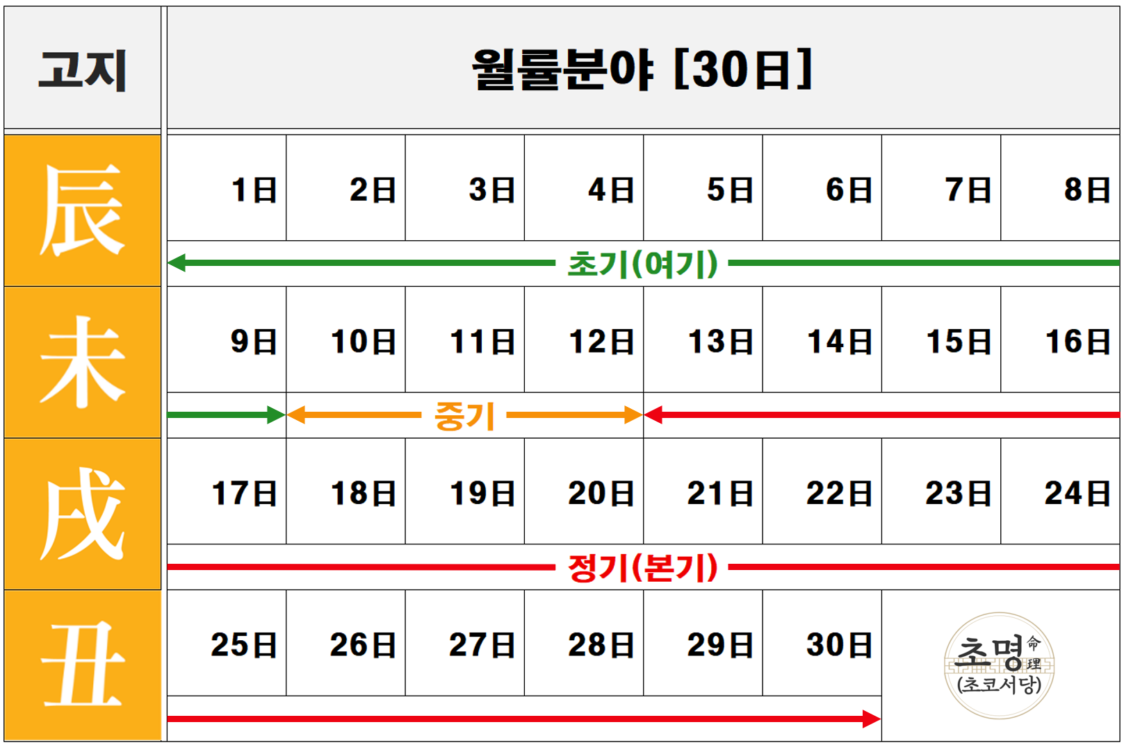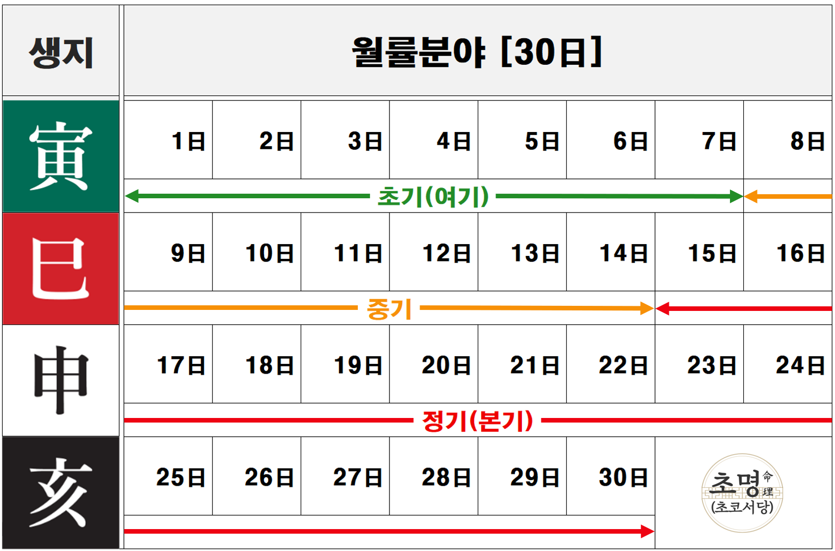 월지의 초기, 중기, 정기를 한달 30일을 기준으로 했을 때 날짜를 배분하여 나누는 이론입니다.