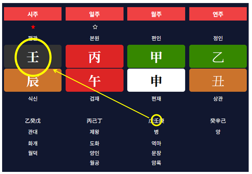 잘 보시면 월지 신금의 중기인 임수가 멀긴 하지만 시간에 투간해있습니다.