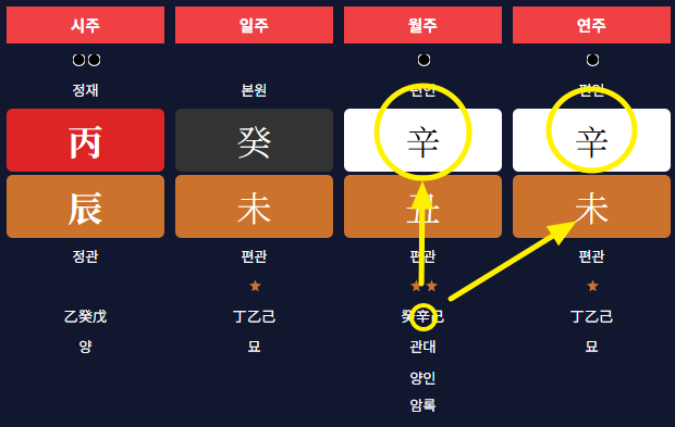 예를 들어 왼쪽 사주의 경우 월지 축중 신금이 월간과 연간에 투간해있습니다.