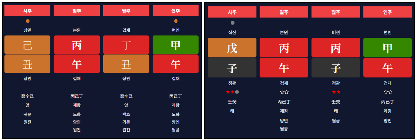 자월 자시, 축월 축시의 병화일간 사주를 예시로 살펴보겠습니다.