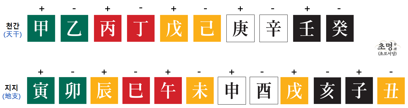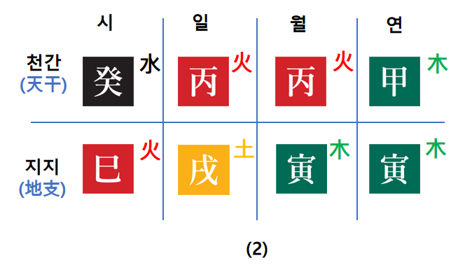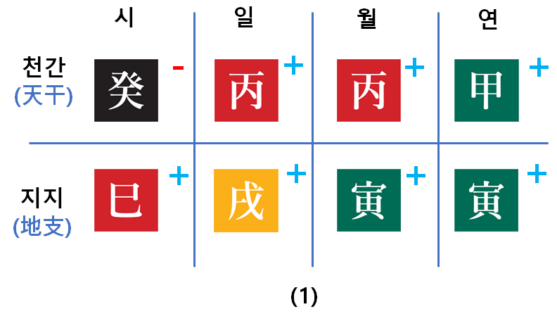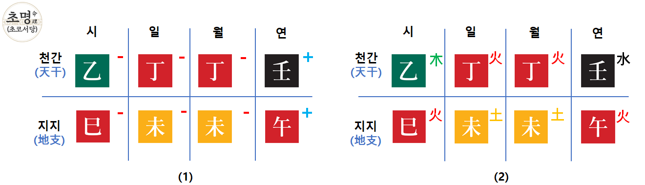 위 (1)번과 (2)번은 같은 사주입니다. (1)번에는 간지 자체의 음양을 (2)번에는 간지가 배속된 오행을 표기했는데요.
