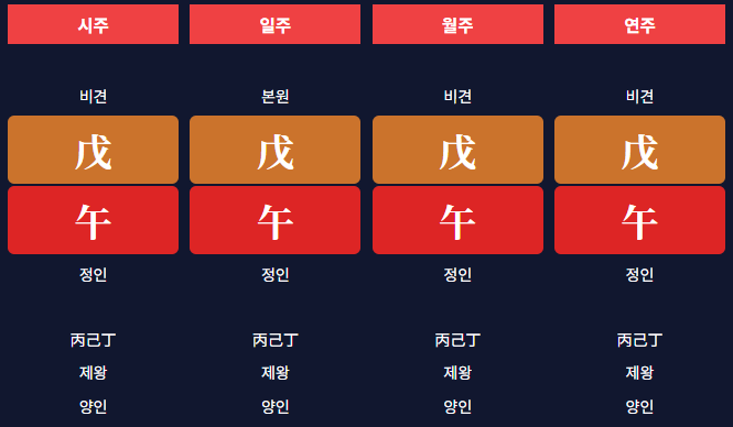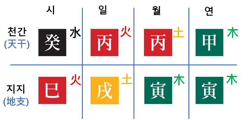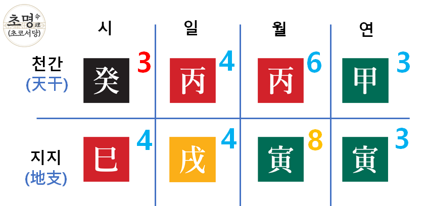 이 사주는 목, 화 오행이 6개, 수 오행은 1개로 양의 기운이 더 강하다는 것을 알 수 있습니다.