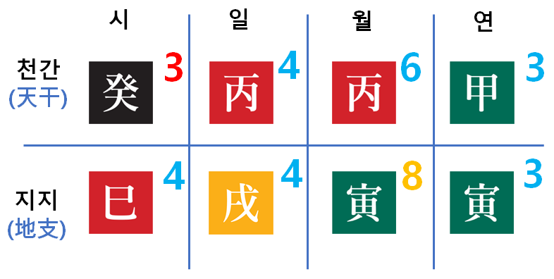 위에서 봤던 왼쪽 사주를 점수로 환산하면 오른쪽과 같습니다.