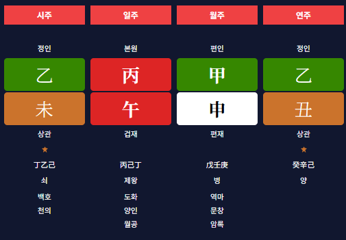 예시로 음력 85년 7월 20일 미시에 태어난 남성의 사주를 달마일장금으로 살펴보겠습니다.