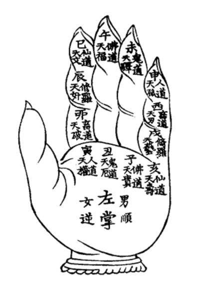 달마일장금은 손바닥에 12지지를 매칭시켜 운명을 판단하는 관법입니다. 이를 나타낸 그림을 불가에서는 불수장결도라고 합니다.