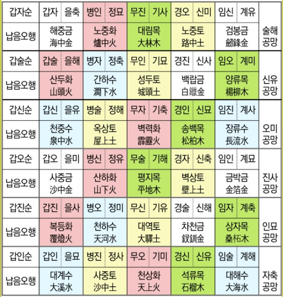 甲子乙丑 海中金 (갑자을축 해중금) 丙寅丁卯 爐中火 (병인정묘 노중화) 戊辰己巳 大林木 (무진기사 대림목) 庚午辛未 路傍土 (경오신미 노방토) 壬申癸酉 劍鋒金 (임신계유 검봉금) …