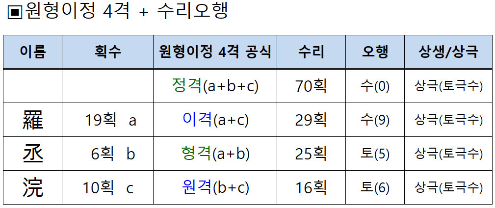 위 이름의 경우 정격과 이격은 수 오행이지만, 형격과 원격이 토 오행이라, 토극수가 되는 양상입니다. 서로 상생되지 않고 극하는 이름이라는 거죠. 단순히 이것만 가지고 좋으냐, 나쁘냐를 따지기는 어렵습니다.