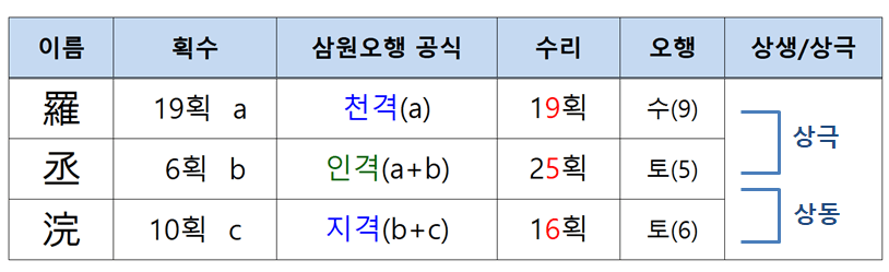 그 다음에는 삼원오행의 공식에 따라 천격, 인격, 지격을 구한 후, 위 하도낙서의 수에 따라 오행을 배속시키면 됩니다.